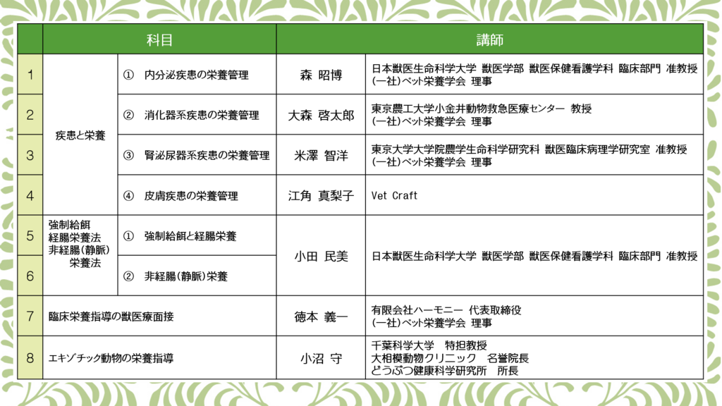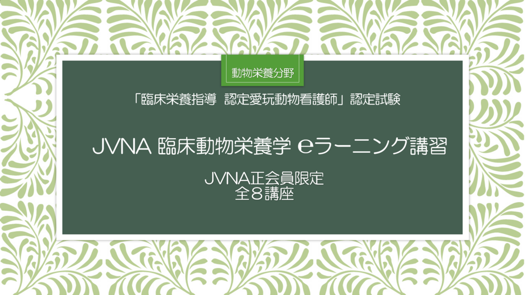 愛玩動物看護師の業務の中で「動物栄養学」は、基礎的な知識に加え疾患や患者動物の個別性を考慮する場面や、栄養管理の継続に関するクライアントとのコミュニケーションの際にも重要なカギとなる分野です。「JVNA臨床動物栄養学eラーニング講習」は、臨床動物栄養学のスペシャリストを目指す方のための学習ツールです。受講期間中繰り返し視聴できます。JVNA正会員はどなたでも受講できます。